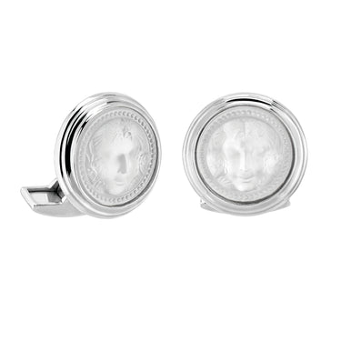 A subtle yet striking expression of classical elegance, the Arethuse Round Cufflinks (Clear) by Lalique embody the maison’s enduring dedication to fine crystal craftmanship. Inspired by Arethusa, the mythological water nymph and historic symbol of beauty and transformation, each cufflink is adorned with a satin-finished clear crystal medallion bearing her finely sculpted profile.