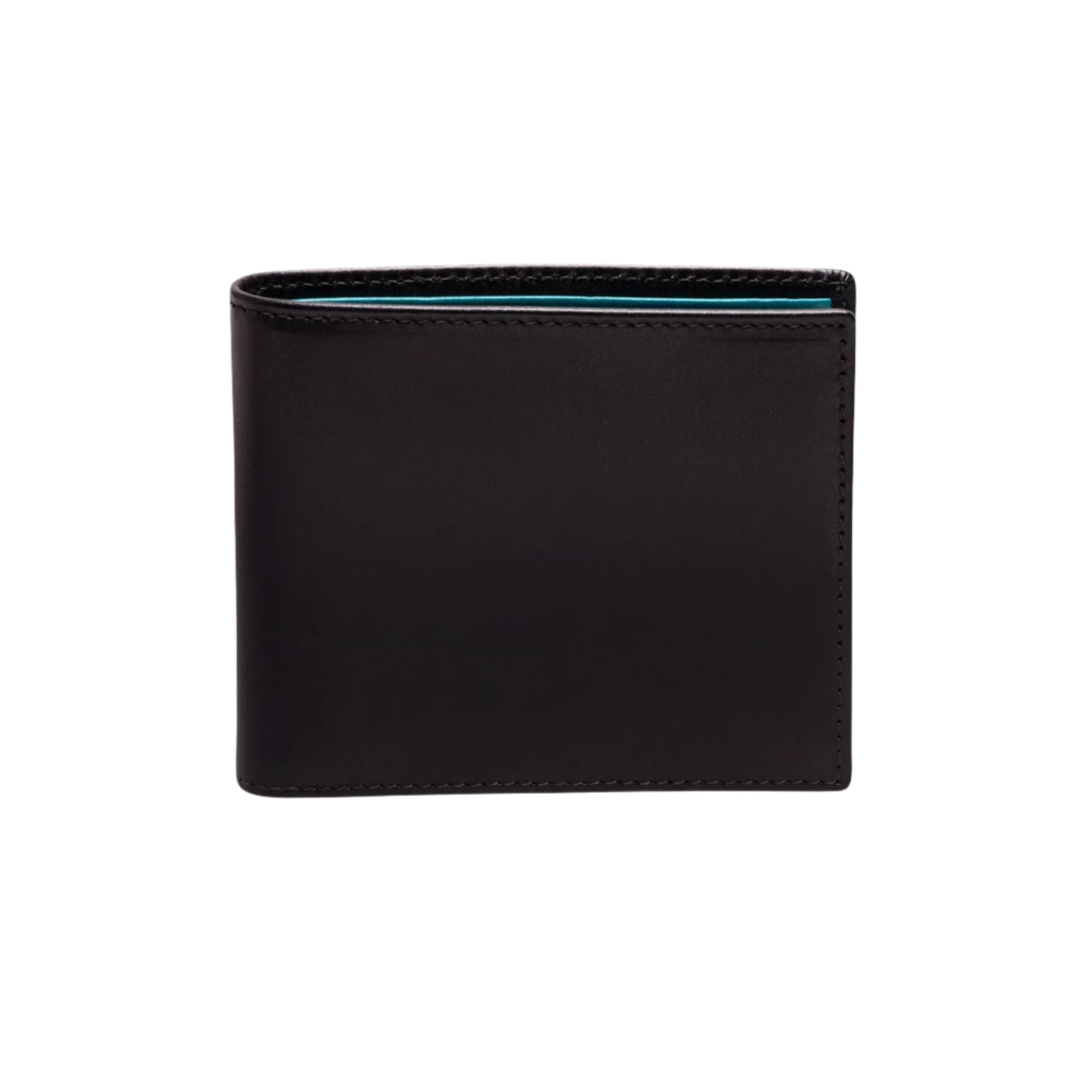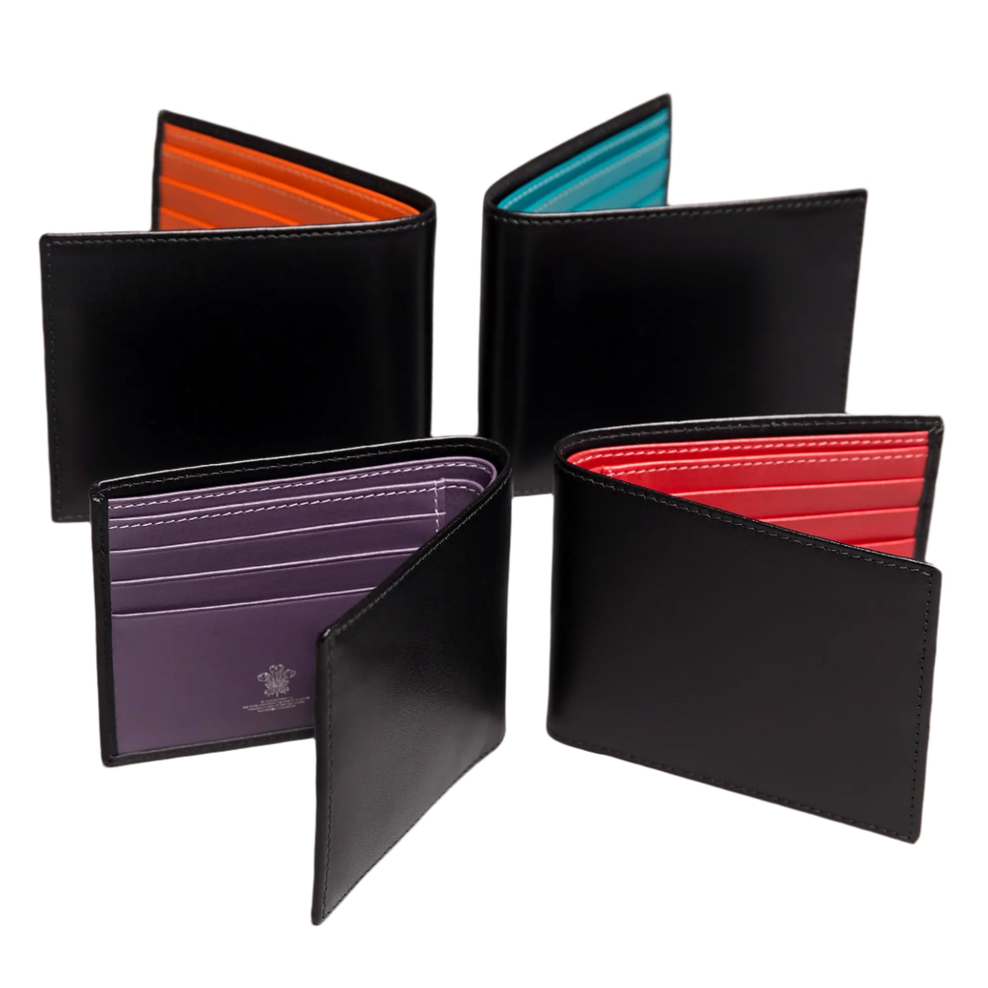 Inspired by the regal hues of the Sterling British notes, this black billfold exudes style and elegance with a pop of colour on the inside. This buttery soft leather is combined with a fine black calf exterior to lend the whole wallet a touch of extreme refinement and timeless appeal.