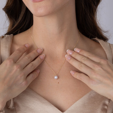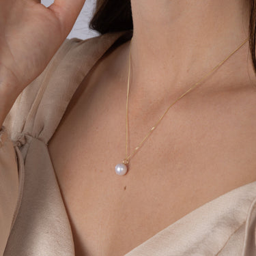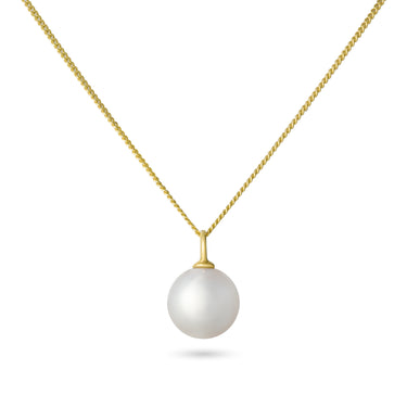 Refined and timeless, this delicate pendant features a radiant 8–8.5mm cultured freshwater pearl, chosen for its soft lustre and natural elegance. The pearl is suspended from a fine 9ct yellow gold setting and paired with an 45cm 9ct yellow gold chain - a length that rests just below the collarbone, perfect for layering or wearing alone.