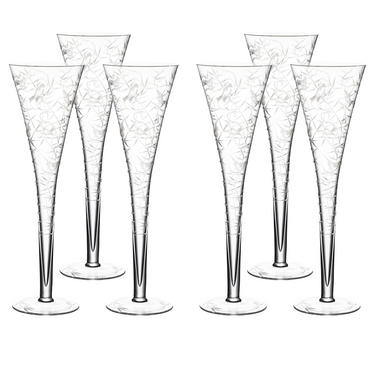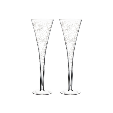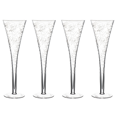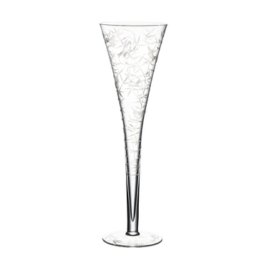 Graceful and light-hearted, this champagne flute features a charming scene of songbirds perched among delicate branches, a whimsical design brought to life through intricate hand-engraving.