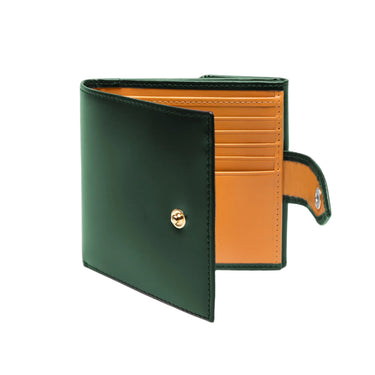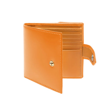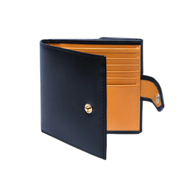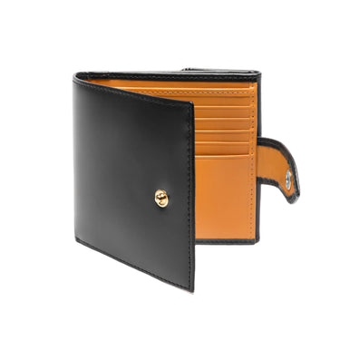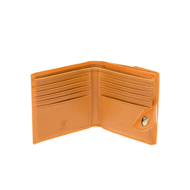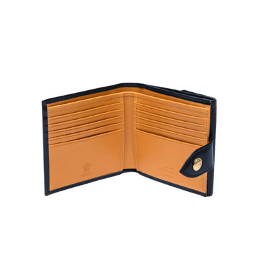 Our traditional billfold in bridle leather and London Tan panel hide is a classic and fits everything you need without having to compromise. The wallet has space for 10 cards, receipts, notes and plenty of coins, and closes with a beautiful Ettinger monogram popper. The London Tan panel hide inside does darken in time and may bruise if put under pressure. We always advise against keeping the Bridle Hide products in trouser pockets, where the pressure and humid conditions may deteriorate the leather prematurely, especially if never cleaned or polished.
