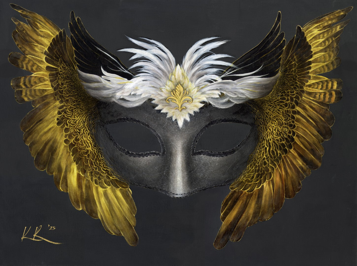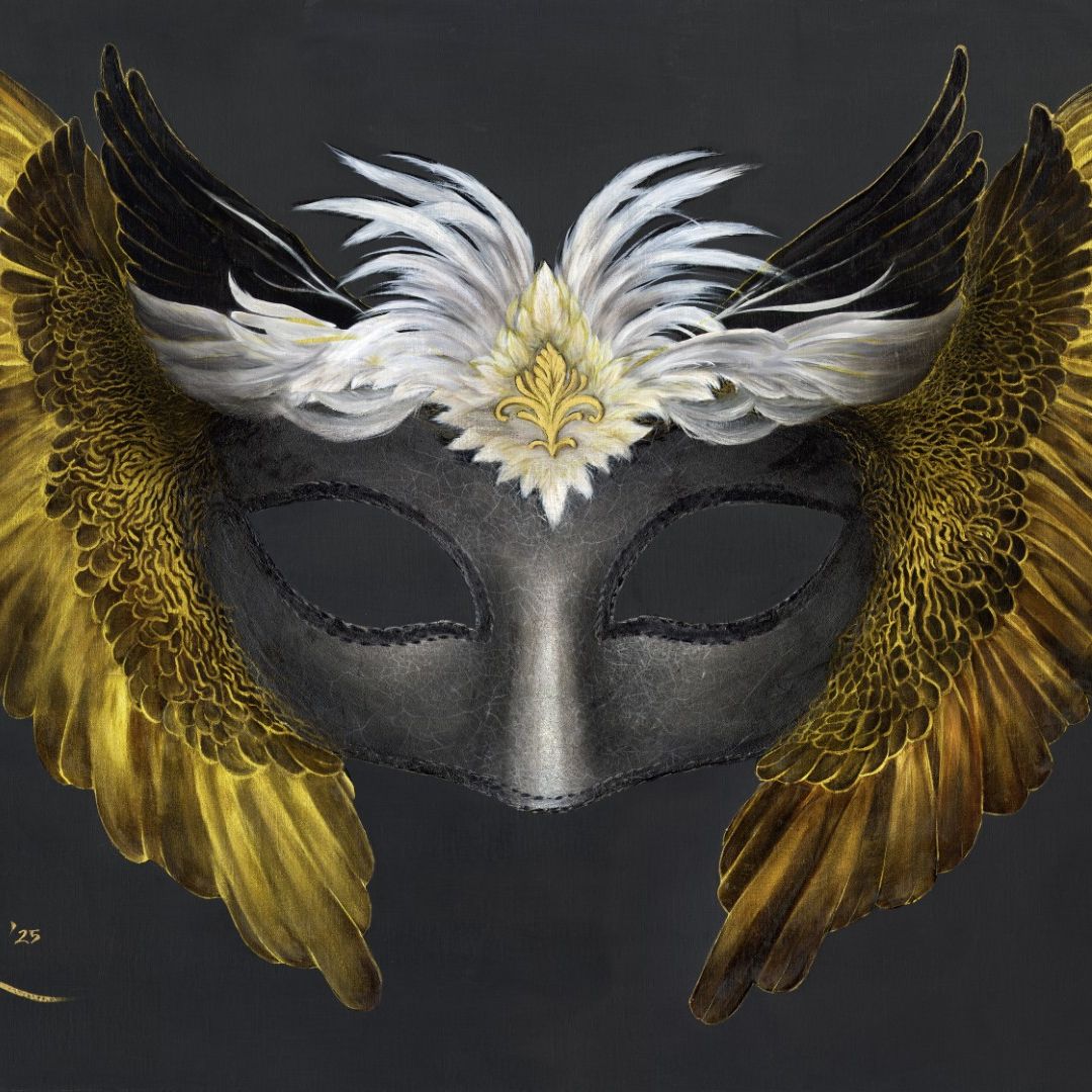 This extraordinary mask is crowned with a gathering of endangered avian icons, each rendered with reverence and precision. At its centre, the majestic Philippine Eagle spreads its sweeping wings from the brow, commanding presence and power. Framing the visage, the rare Sociable Lapwing lends its ghostly patterned crest, while subtle flashes of silvery plumage evoke the elusive White-bellied Heron drifting at the periphery. Along the helm, the Kagu’s distinctive crest flows seamlessly into the eagle’s bold wing motifs, uniting these rare creatures in a single, harmonious composition.